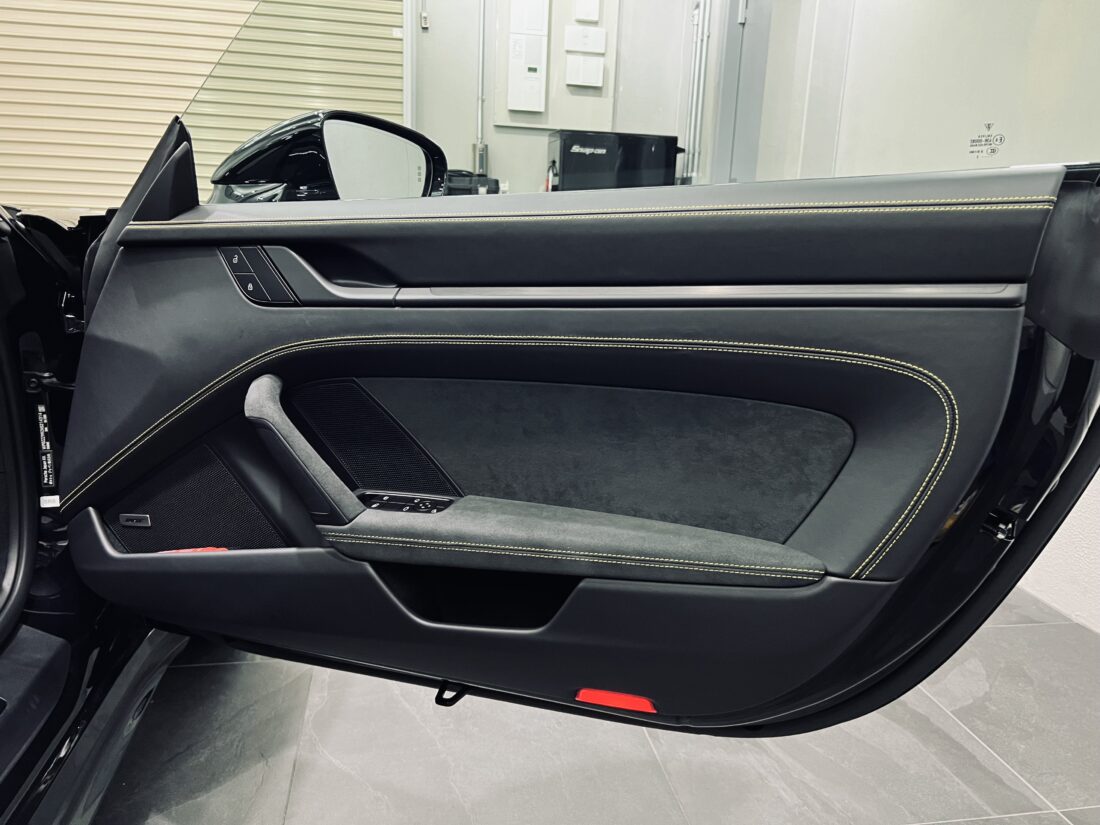 高額なレザーインテリアパッケージを装着されております。なのでドアトリムもレザー張りとなり豪華絢爛。イエローステッチがスポーティな要素をプラスしてくれます。