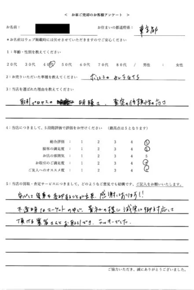 今回ご売却をお任せいただいたオーナー様より口コミアンケートも頂きました。