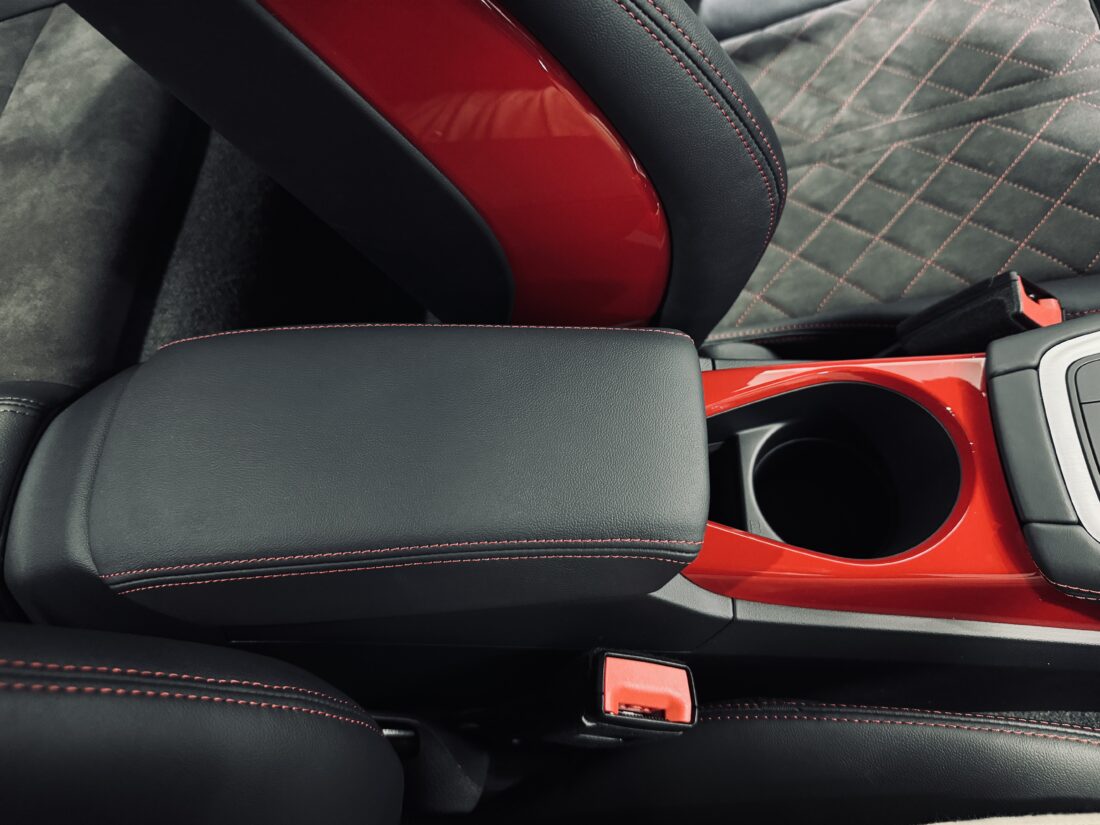 ・ドアアームレストやセンターコンソールに採用されたレザーと赤色のアクセントステッチ。